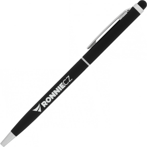 Elegantní, tenká a lehká propisovací tužka s kovovými stříbrnými prvky a stylusem.